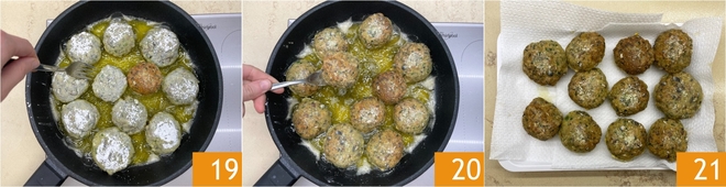 Frittieren Sie die Bällchen auf beiden Seiten 19 bis sie goldbraun sind 20, dann legen Sie sie auf Küchenpapier 21.