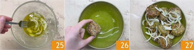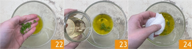 Um die Soße vorzubereiten, geben Sie in eine Schüssel das Öl, die gehackten Petersilienstiele 22, den Essig 23 und die in Scheiben geschnittene Zwiebel 24.