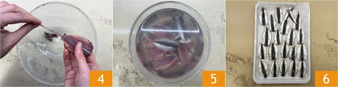 Um die Sardellenbällchen zuzubereiten, kümmern Sie sich zuerst um das Säubern des Fisches: Spülen Sie die Sardinen unter fließendem Wasser ab, um die Schuppen zu entfernen. Entfernen Sie dann die Flosse und den Kopf 1. Machen Sie einen Schnitt entlang des Bauches, um sie aufzuklappen 2, entfernen Sie die Eingeweide und die Gräte 3.