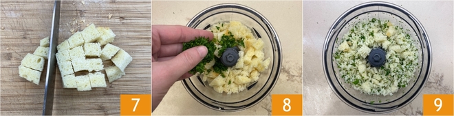 In der Zwischenzeit schneiden Sie das Brotinnere in Würfel 7 und geben es in einen Mixer. Fügen Sie die Petersilie hinzu 8 und mixen Sie grob 9.