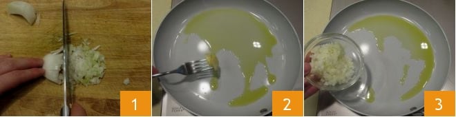 Um die sardischen Gnocchetti nach Bauernart zuzubereiten, beginnen Sie damit, einen Topf mit Salzwasser auf den Herd zu stellen. In der Zwischenzeit schälen und hacken Sie die Zwiebel fein 1. Beträufeln Sie eine große Pfanne mit einem Schuss Öl, braten Sie eine ganze Knoblauchzehe bei niedriger Hitze an 2, entfernen Sie sie dann, wenn sie goldbraun ist, und geben Sie die gehackte Zwiebel in die Pfanne 3. Rühren Sie gelegentlich um, damit sie nicht anbrennt.