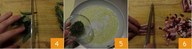 Während die Zwiebel brät, hacken Sie den Salbei und den Rosmarin (lassen Sie ein paar ganze Nadeln übrig, um das fertige Gericht zu dekorieren, falls gewünscht) 4, und braten Sie sie zusammen mit der Zwiebel an 5. Schneiden Sie den Speck in Streifen 6,