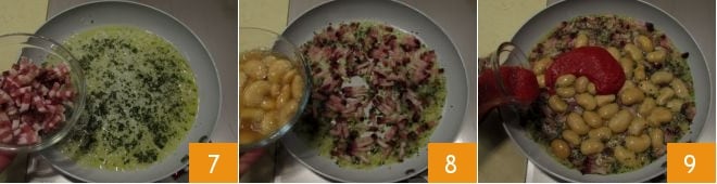 und fügen Sie ihn der Zwiebelmischung hinzu 7; würzen Sie dann mit frisch gemahlenem Pfeffer. Fügen Sie die weißen Bohnen zusammen mit ihrem Konservenwasser hinzu 8 und gießen Sie schließlich die Tomatenpassata dazu 9.