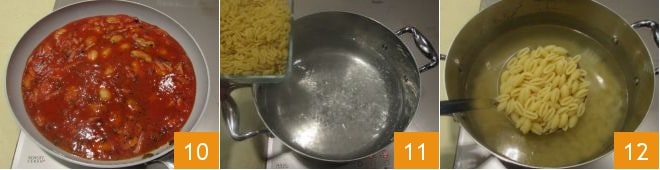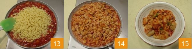 Vermischen Sie die Zutaten gut und lassen Sie sie 12 Minuten bei starker Hitze weiterkochen 10. In der Zwischenzeit, wenn das Wasser zum Kochen kommt, kochen Sie die Gnocchetti für die auf der Packung angegebene Zeit 11. Sobald sie gekocht sind (am besten al dente), schöpfen Sie sie mit einem Schaumlöffel ab 12,