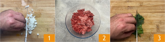 Um die Sarmale zuzubereiten, putzen und schneiden Sie zuerst die Zwiebeln fein mit dem Messer 1, dann geben Sie das Hackfleisch vom Rind, Kalb und Schwein in eine Schüssel 2. Hacken Sie Petersilie und Dill fein 3.