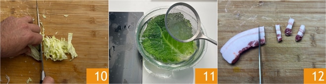 Schneiden Sie den restlichen Wirsing in feine Streifen 10. Blanchieren Sie die intakten Wirsingblätter in gesalzenem kochendem Wasser für 5-8 Minuten, dann abtropfen lassen und in kaltem Wasser abschrecken 11. In der Zwischenzeit schneiden Sie den geräucherten Speck in Streifen von etwa 1 cm Dicke 12.