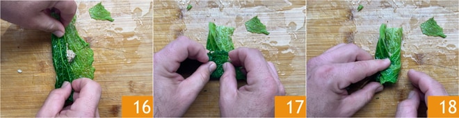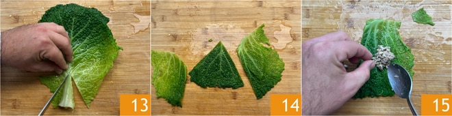Tropfen Sie die Wirsingblätter gut ab, entfernen Sie die zentrale Rippe 13 und teilen sie in 3 Teile 14. Platzieren Sie einen Teelöffel Füllung in der Mitte 15.