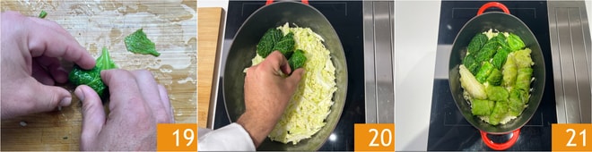 Rollen Sie die Rouladen zur Schließung 19, dann legen Sie sie mit der Naht nach unten auf den Boden eines antihaftbeschichteten Topfes, in dem Sie den in Streifen geschnittenen Wirsing verteilt haben 20. Bilden Sie so eine erste Schicht Rouladen 21.