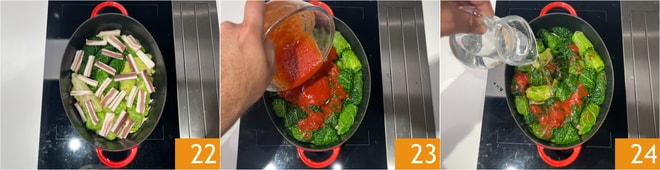 Fügen Sie die Streifen des geräucherten Specks hinzu 22 und bedecken Sie mit einer zweiten Schicht Rouladen. An diesem Punkt gießen Sie das Tomatenpüree 23 und das Wasser 24; stellen Sie sicher, dass die Flüssigkeit die Rouladen vollständig bedeckt.