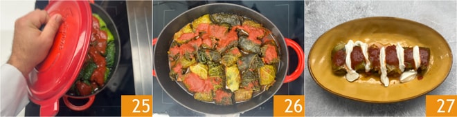 Schließen Sie mit dem Deckel 25 und kochen bei schwacher Hitze für etwa 3 Stunden. Nach dem Kochen 26 richten Sie die Rouladen vorsichtig an und vervollständigen mit saurer Sahne. Ihre Sarmale sind servierbereit 27!
