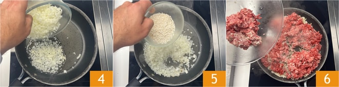 Erhitzen Sie in einer Pfanne die Zwiebel mit dem Pflanzenöl für ein paar Minuten 4, dann fügen Sie den Reis hinzu 5 und kochen ihn für etwa 2 Minuten. Jetzt geben Sie die Hackfleischmischung hinzu 6, rühren gut um und kochen für 20 Minuten.