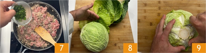 Am Ende der Garzeit würzen Sie mit gehackter Petersilie und Dill 7. Übertragen Sie alles in eine Schüssel und lassen es vollständig bei Raumtemperatur abkühlen. In der Zwischenzeit lösen Sie die größten Blätter des Wirsings, achten darauf, sie nicht zu brechen, und legen sie beiseite 8. Entfernen Sie den zentralen Strunk 9.