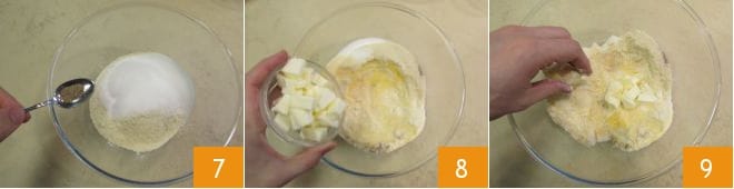und den Kardamom 7. Geben Sie die kalte Butter, in Würfel geschnitten, hinzu 8 und beginnen Sie, alles nur mit den Fingerspitzen zu mischen 9.