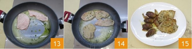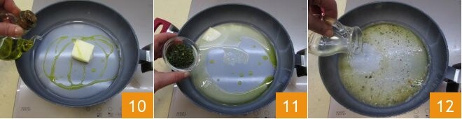 Danach nehmen Sie eine weitere antihaftbeschichtete Pfanne. Schmelzen Sie bei niedriger Hitze die Butter mit einem Schuss Öl 10. Wenn die Butter geschmolzen ist, fügen Sie die gehackten Rosmarin- und Salbeiblätter hinzu 11. Fügen Sie nun den Weißwein zum Ablöschen hinzu 12.