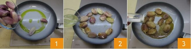 Um die Schnitzel mit Rosmarin und Salbei mit karamellisierten Schalotten zuzubereiten, beginnen Sie damit, eine Gemüsebrühe vorzubereiten. Während Sie die Gemüsebrühe zubereiten, nehmen Sie die Schalotten. Entfernen Sie die äußere Schale und halbieren Sie sie. Nehmen Sie nun eine antihaftbeschichtete Pfanne und geben Sie etwas Öl hinein. Fügen Sie die halbierten Schalotten hinzu 1 und wenden Sie sie, damit sie gleichmäßig anbraten. Löschen Sie sie mit der Gemüsebrühe ab 2 und würzen Sie mit Salz 3 und Pfeffer. Decken Sie die Pfanne mit einem Deckel ab und lassen Sie sie 10 Minuten lang bei starker Hitze je nach Dicke der Schalotten garen. Stechen Sie mit einer Gabel in die Schalotten, um zu prüfen, ob sie gar sind.