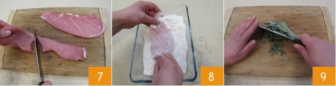 Fahren Sie nun mit der Zubereitung der Schnitzel fort. Legen Sie die Schnitzel auf ein Schneidebrett und schneiden Sie sie in kleine Scheiben 7. Geben Sie dann das Mehl in einen großen Behälter und mehlieren Sie die Fleischscheiben, indem Sie sie von allen Seiten wälzen 8. Es ist wichtig, dass die Scheiben vollständig mit Mehl bedeckt sind. Legen Sie die mehlierten Scheiben auf einen Teller beiseite. Nehmen Sie dann den Salbei und den Rosmarin. Entfernen Sie die Nadeln vom holzigen Teil des Rosmarins. Hacken Sie Salbei und Rosmarin fein zusammen 9. Stellen Sie die gehackten Gewürze in einer kleinen Schüssel beiseite.
