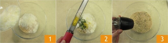 Um die Scamorza-Spieße auf dem Grill vorzubereiten, waschen Sie zuerst das gesamte Gemüse, die Zitronen und die Blätter. Trocknen Sie sie dann gut ab. Bereiten Sie jetzt die Panade vor. Zerkleinern Sie das Brot grob und geben Sie es in eine Schüssel. Fügen Sie den geriebenen Grana, die Rosmarinnadeln und die Schale von 2 Zitronen hinzu 2. Fügen Sie eine Prise Salz und eine Prise Pfeffer hinzu 3.