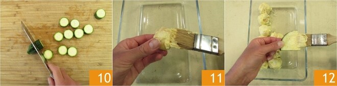 Schneiden Sie die Zucchini in dicke Scheiben 10. Lassen Sie die Kirschtomaten ganz. Nehmen Sie nun die kleinen Scamorza-Käse und bestreichen Sie sie mit Mayonnaise 11. Machen Sie dasselbe mit dem gesamten Gemüse 12, außer mit den Kirschtomaten und geben Sie sie in eine Auflaufform.