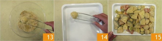 Wälzen Sie dann die kleinen Scamorza-Käse in der Panade 13 und legen Sie sie auf ein anderes Tablett 14, dann machen Sie dasselbe mit dem restlichen Gemüse 15.
