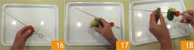 Jetzt die Spieße zusammenstellen. Stecken Sie zuerst eine Kirschtomate auf 16, wickeln Sie dann eine der kleinen Scamorza-Käse in ein Zitronenblatt 17, bevor Sie sie auf den Spieß stecken. Fügen Sie nun eine Zucchini 18, eine Paprika und ein Stück Aubergine hinzu.