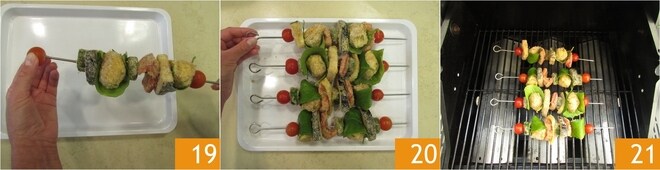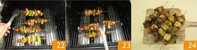 Schließen Sie den Deckel des Grills und grillen Sie die Spieße etwa 5 Minuten. Wenn sie gut gebräunt sind, drehen Sie sie 22 und grillen Sie sie kurz auf der anderen Seite. Nehmen Sie die Spieße mit einer Zange vom Grill 23 und legen Sie sie auf ein Schneidebrett 24. Fügen Sie noch etwas Zitronenschale hinzu und servieren Sie sie heiß mit Mayonnaise und einem Spritzer Zitrone nach Belieben.