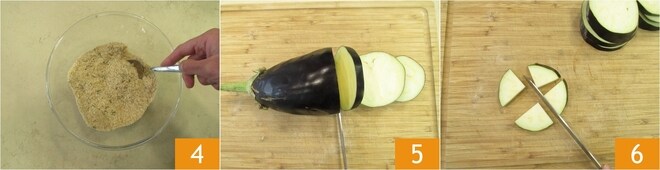 Gut mischen 4 und beiseite legen. Jetzt kümmern Sie sich um das Gemüse. Beginnen Sie mit den Auberginen, schneiden Sie sie zunächst in 1 cm dicke Scheiben 5 und dann in Stücke 6.