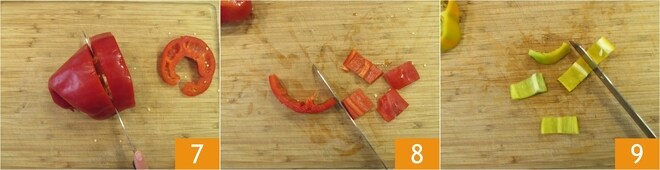 Dann bearbeiten Sie die rote Paprika, schneiden Sie sie in dicke Scheiben 7, entfernen Sie die inneren Samen und schneiden Sie sie in Stücke 8. Machen Sie dasselbe mit der gelben Paprika 9.