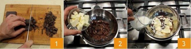 Um den Kuchen in Scheiben vorzubereiten, bereiten Sie zuerst den Boden vor: Hacken Sie die dunkle Schokolade 1 und lassen Sie sie zusammen mit den Butterstückchen im Wasserbad schmelzen 2. Gießen Sie die Milch langsam hinzu 3 und