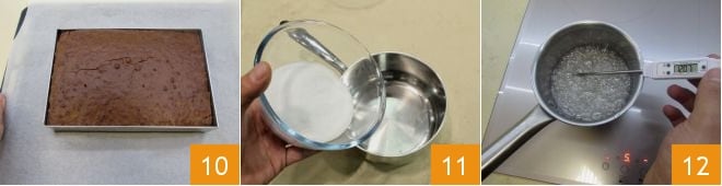 Nach dem Backen nehmen Sie den Boden aus dem Ofen 10 und lassen Sie ihn abkühlen. In der Zwischenzeit kümmern Sie sich um die Buttercreme: Geben Sie in einen Topf mit dickem Boden das Wasser und den Zucker 11 und erhitzen Sie es bei niedriger Hitze, indem Sie gelegentlich mit einem Stahlkochlöffel umrühren. Wenn der Zucker geschmolzen ist, überprüfen Sie, ob die Temperatur des Sirups 121° erreicht 12.