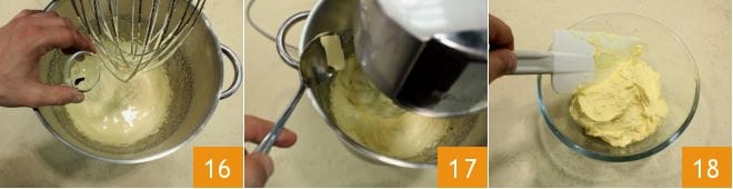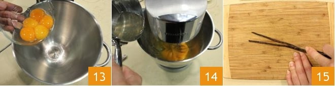 Geben Sie in der Zwischenzeit die Eigelbe in eine Küchenmaschine 13 und beginnen Sie, sie bei höchster Geschwindigkeit zu schlagen; fügen Sie den Zuckersirup langsam hinzu 14 und schlagen Sie weiter, bis die Masse vollständig abgekühlt ist. Während die geschlagenen Eigelbe abkühlen, schneiden Sie eine Vanilleschote der Länge nach auf und kratzen Sie die Samen mit einem kleinen Messer aus 15.
