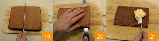 Wenn der Kuchen vollständig abgekühlt ist, halbieren Sie ihn, um zwei Kuchen zu erhalten 19, und schneiden Sie ihn dann horizontal in 3 Teile 20. Füllen Sie den Boden mit einem Teil der Buttercreme mit Hilfe eines Spatels 21, dann