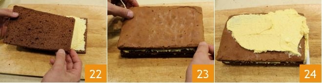 legen Sie das zweite Rechteck darauf 22; füllen Sie auch die zweite Schicht und bedecken Sie sie schließlich mit der letzten 23. Bedecken Sie die Oberfläche und die Ränder des Kuchens mit der Buttercreme und verteilen Sie sie gleichmäßig 24.