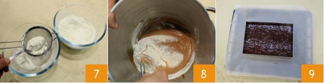 das Mehl 7, und geben Sie die trockenen Zutaten nach und nach zur Mischung hinzu. Mischen Sie von unten nach oben mit einem Spatel, um die Mischung zu vermengen 8. Gießen Sie den Teig in eine rechteckige Backform mit den Maßen 20x25 cm 9 und backen Sie ihn im vorgeheizten statischen Ofen für 45 Minuten bei 170 ° (bei Umluftofen bei 150° für 35 Minuten).