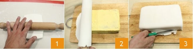 Wenn Sie die Kuchen gefüllt haben, nehmen Sie den Fondant und rollen Sie ihn mit einem Nudelholz auf einer mit Puderzucker bestäubten Arbeitsfläche aus 1. Bedecken Sie dann die Kuchen 2, indem Sie die Oberfläche mit einem Glätter glätten. Mit einem glatten Klingenmesser verfeinern Sie die Ränder 3
