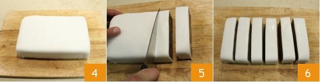 um die überflüssigen Teile zu entfernen 4, dann schneiden Sie 6 Stücke mit einer Dicke von 4,5 cm (5-6). Mit unseren Mengen sollten Sie insgesamt 12 Stücke erhalten
