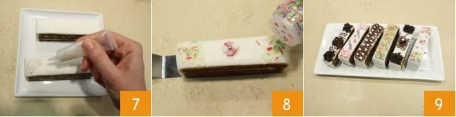 Mit der Gel-Dekoration dekorieren Sie die Oberfläche jeder Scheibe 7. Nehmen Sie jetzt die endgültigen Dekorationen aus bunten Zuckerstreuseln und wenden Sie sie auf jede Scheibe an, um verschiedene dekorative Muster zu schaffen (8-9).