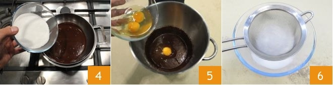 den Zucker 4, und rühren Sie, um alles aufzulösen. Übertragen Sie die Mischung in eine Küchenmaschine mit Rührbesen und lassen Sie sie abkühlen; fügen Sie die Eier nacheinander hinzu und stellen Sie sicher, dass das vorherige vollständig eingearbeitet ist, bevor Sie das nächste hinzufügen 5: Schalten Sie den Rührbesen ein und mischen Sie. Sieben Sie das Backpulver 6,