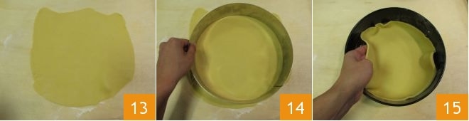 Bestäuben Sie eine Arbeitsfläche mit wenig Mehl und rollen Sie eine Portion Mürbeteig aus, bis Sie eine Dicke von 5 mm erreichen 13. Wenn die Raumtemperatur sehr hoch ist, bewahren Sie den restlichen Mürbeteig im Kühlschrank auf. Mit einem 26 cm Ring formen Sie die erste Mürbeteigscheibe 14 und legen Sie diese in eine Springform von 22 cm. Da die Scheibe größer als die Form ist, entsteht natürlich ein Rand 15, der die Marmelade enthält.