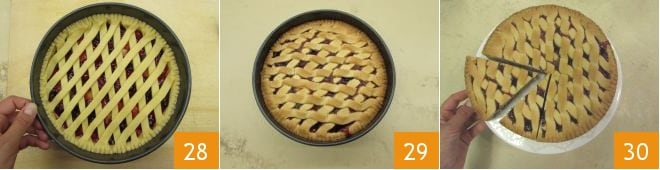 Nehmen Sie dann das letzte verbliebene Teigstück, rollen Sie es auf eine Dicke von einem halben cm aus und schneiden Sie 1 cm breite Streifen, die länger als der Durchmesser der Torte sind 22. Platzieren Sie dann die erste Reihe von Streifen 23, indem Sie sie parallel anordnen und dazwischen Abstand lassen. Drehen Sie dann die Form und machen Sie eine zweite Reihe von Streifen, die Sie im Vergleich zu den unteren drehen 24.