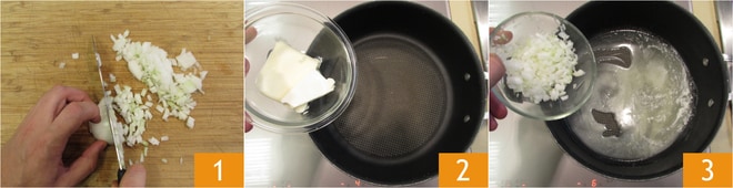 Um die Schinken-Kroketten zuzubereiten, hacken Sie eine Zwiebel fein 1. Schmelzen Sie die Butter in einem Topf 2 und dünsten Sie die Zwiebel bei mittlerer bis niedriger Hitze 10 Minuten lang 3.
