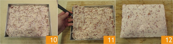 Sobald eine dichte Konsistenz erreicht ist, geben Sie die Mischung in eine Form 10, lassen Sie sie bei Raumtemperatur abkühlen und stellen Sie sie für mindestens 2 Stunden in den Kühlschrank. Nehmen Sie den Teig aus dem Kühlschrank und kippen Sie ihn auf ein Schneidebrett 11 12.