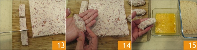 Schneiden Sie mit einem Messer 10 gleich große Rechtecke 13. Formen Sie daraus mit angefeuchteten Händen Kroketten. Tauchen Sie die Kroketten zuerst in die geschlagenen Eier 15