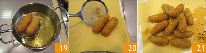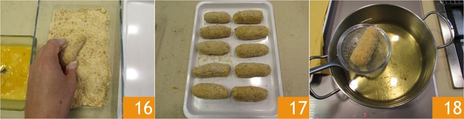 und dann in die Semmelbrösel 16. Während Sie sie panieren, legen Sie sie auf ein Tablett 17. Erhitzen Sie das Pflanzenöl und bringen Sie es auf 170°C. Frittieren Sie die Kroketten maximal 2 gleichzeitig für 3 Minuten 18.