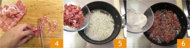 Inzwischen schneiden Sie den Schinken in Streifen 4, geben ihn in die Pfanne 5 und braten ihn 1 Minute lang. Fügen Sie das Mehl auf einmal hinzu 6 und rösten Sie es 2 Minuten lang.