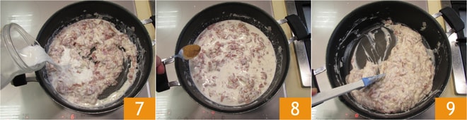 Gießen Sie die Milch in 3 Portionen hinzu 7 und würzen Sie mit Muskatnuss 8. Es sollte eine Art sehr dichte Béchamel entstehen, dafür werden mindestens 6 Minuten benötigt 9.