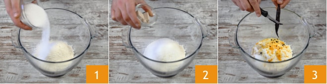 Um den schnellen Oster-Colomba zuzubereiten, geben Sie zuerst das Manitoba-Mehl und den Zucker in die Schüssel einer Küchenmaschine 1. Fügen Sie die Hefe 2, die Orangenschale, die Zitronenschale und die Samen einer Vanilleschote hinzu 3.