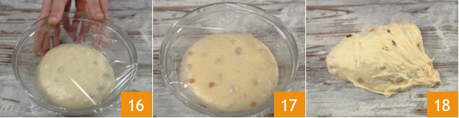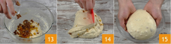 Fügen Sie nun die kandierten Früchte und die zuvor im Orangensaft eingeweichten und abgetropften Rosinen hinzu 13. Kneten Sie noch einige Minuten weiter, bis alle Zutaten gut eingearbeitet sind. Legen Sie den Teig auf eine gut gebutterte Arbeitsfläche und falten Sie ihn mit einer Teigkarte 14. Nehmen Sie den Teig mit gebutterten Händen und legen Sie ihn in eine Schüssel 15.