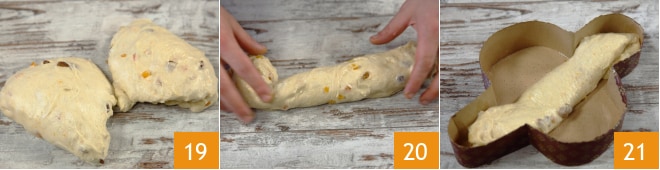 und teilen Sie ihn mit der Teigkarte in zwei gleiche Teile 19. Dehnen Sie eine der beiden Portionen mit den Händen aus und formen Sie sie dann zu einem Zylinder 20. Legen Sie sie in eine Papierform, sodass sie den Körper der Colomba bildet 21.