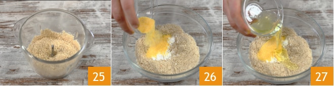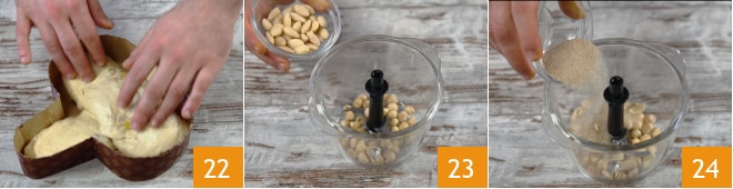 Machen Sie dasselbe mit dem zweiten Teigstück und legen Sie es in die Form, sodass es die Flügel der Colomba bildet 22. Lassen Sie den Teig nun 2 Stunden gehen oder bis er 1,5 cm von der Oberkante der Form entfernt ist. Wenn er aufgegangen ist, bereiten Sie die Glasur vor: Geben Sie die Haselnüsse, die Mandeln 23 und den braunen Zucker 24 in einen Mixer.