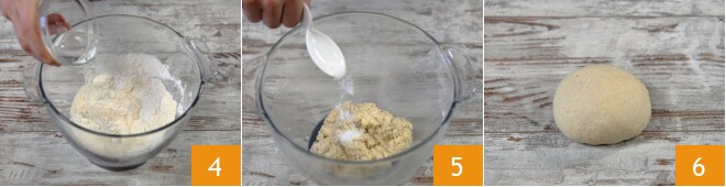 Stellen Sie die Küchenmaschine auf niedrige Geschwindigkeit und fügen Sie das Wasser nach und nach hinzu 4. Wechseln Sie dann den Flachrührer gegen den Knethaken aus und kneten Sie den Teig etwa 5 Minuten lang. Fügen Sie das Salz hinzu 5 und kneten Sie noch ein paar Minuten weiter, bis ein homogener Teig entsteht. Legen Sie den Teig auf eine Arbeitsfläche und formen Sie ihn zu einer Kugel 6.